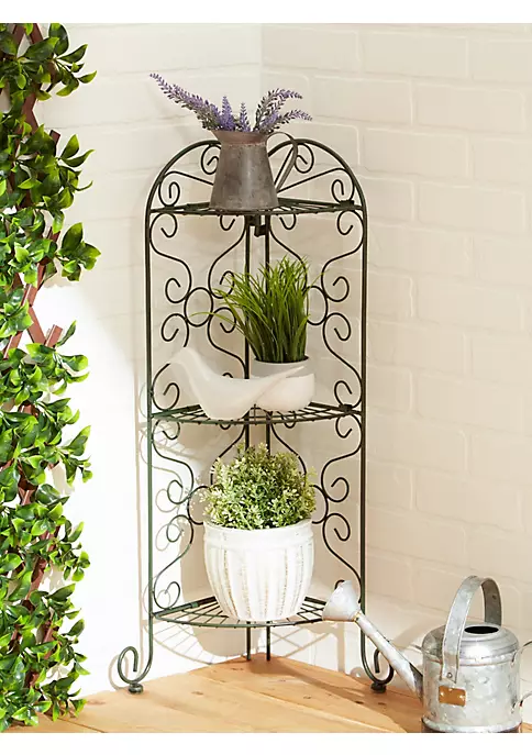Verdigris-style plant stand is antiqued. Works as a plant stand or for display items. Corner design saves space. Shelves can unhook and fold down so that the entire unit can be collapsed flat for storage. Metal. Each shelf is 12.5 inches wide and 9 inches deep. Overall: 30.25 inches tall.