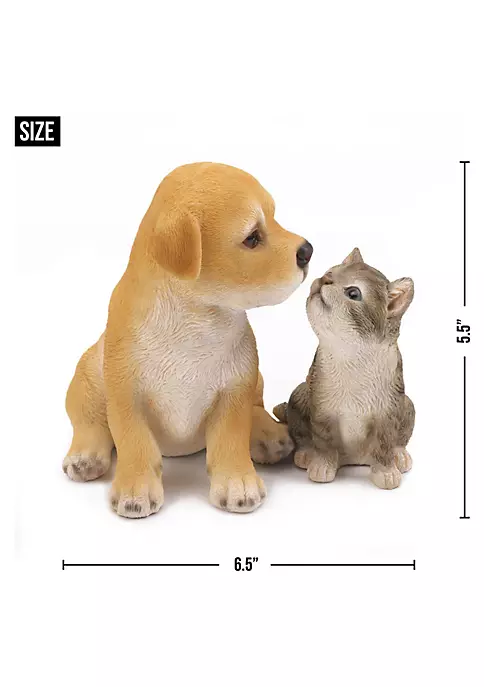 This adorable figurine features two best buds, an orange puppy and gray cat, sitting side by side. Suitable for indoor or outdoor use in a sheltered area. Figurine is all one piece. Fur and eyes are incredibly realistic!