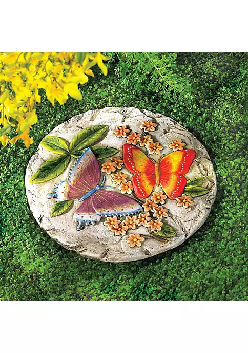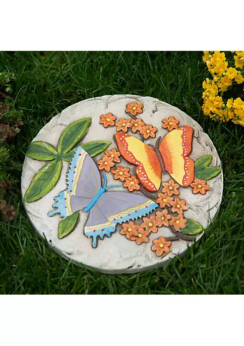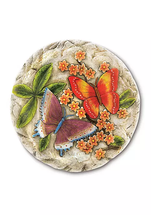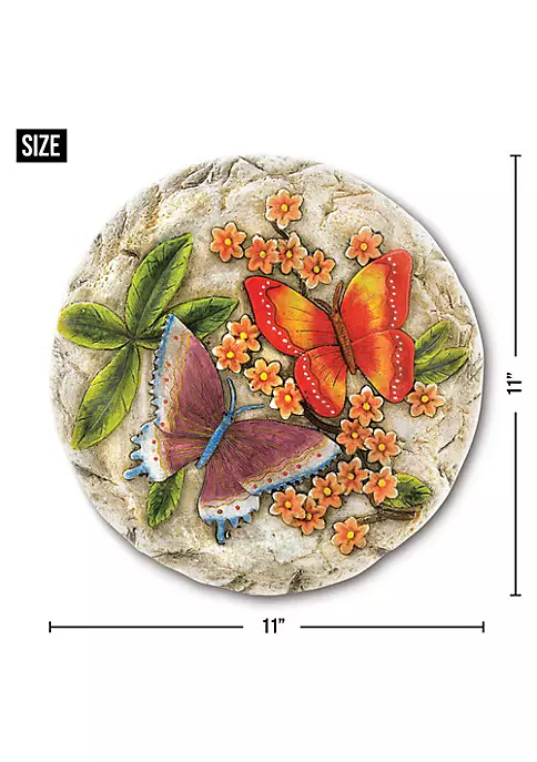 Bas-relief stepping stone features vivid butterflies frolicking in the foliage. Weight 3.7 pounds. Cement. 11 inches in diameter x 1 inch thick.