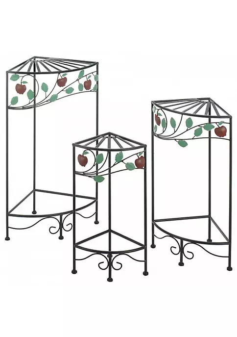 Charming plant stand set includes three corner stands of various heights. Perfect for farmhouse themes, these plant stands feature a fun apple design with vines and scrollwork at the bottom. Weight of set: 8.6 pounds Large: 16 x 11 x 27 inches tall. Medium: 14 x 10 x 23 inches tall. Small: 11 x 8 x 19 inches tall. Maximum weight limit: 4.4 pounds each stand. Iron.