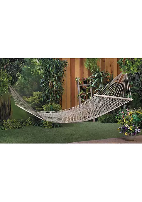 Comfortable and cozy canvas hammock. Put one up your yard for an inviting spot to take an afternoon snooze. Max weight on hammock: 264 pounds. Weight 5 pounds. Recycled cotton, wood frame, rope for hanging. 47.25 x 106.25 inches.