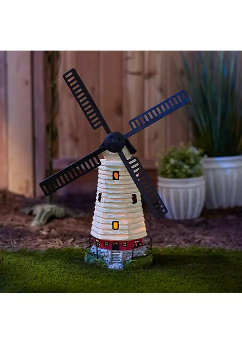 Unique garden decor item is a lighthouse that’s also a windmill. During the day, the solar panel collects the sun’s energy, and at night, the light inside the lighthouse lights up and shows through the little windows. Note that the blades on the windmill do not turn. They are fixed in place.