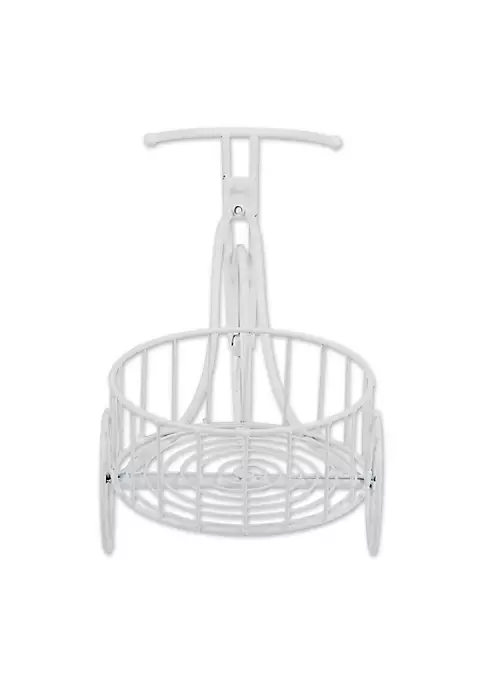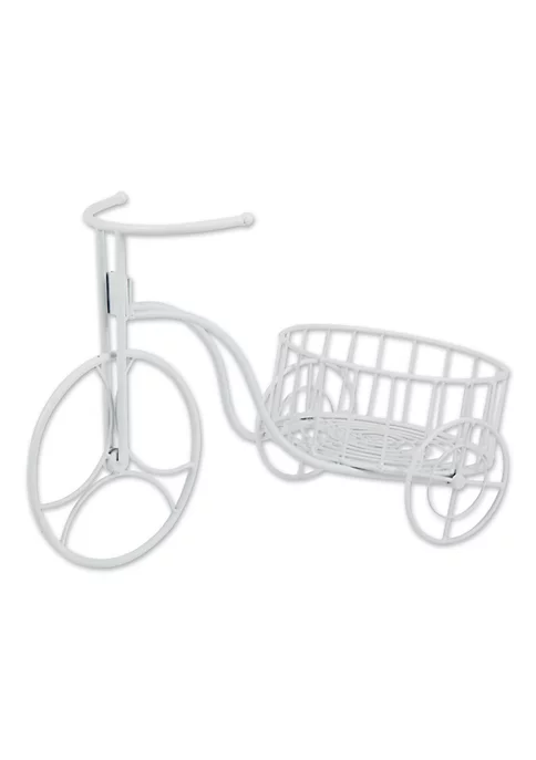 Metal planter looks like an old-fashioned tricycle. Holds a plant in the back, and the white makes a beautiful contrast with greenery or bright flowers. Display it indoors or outdoors.